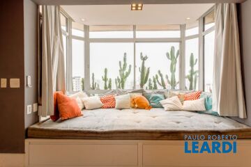 Maravilhosa Cobertura Triplex, Mobiliada, com Jacuzzi aquecida e Hidromassagem • Ao lado do campus da PUC, e do teatro TUCA. A 100 m da futura estação de metrô PUC, além de estar próxima a diversos colégios, de ensino fundamental e médio. Andar térreo: Sala de Estar, lavabo, cozinha em open space, e área de serviço. Amplo e confortável futon projetado dentro de uma baywindow com paisagismo de cactus exóticos e uma linda vista para cidade. Lavabo com vista panorâmica. Cozinha integrada com a sala de estar, separada por uma mesa meia lua projetada em laca branca. 2 quartos, sendo uma suíte máster com closet espaçoso(com iluminação independente no varão dos cabides) (pode ser convertido em 3 quartos). Segundo andar: O ANDAR DO ENTRETENIMENTO, com uma ampla área externa para receber convidados. A parte interna conta com instalação para Home Theater, mesa de jantar, um baywindow com vista panorâmica e um lavabo. A parede lateral é tomada por um bar do chão ao teto com nichos espelhados que integram com a cozinha gourmet. Churrasqueira elétrica americana Char Broil, com exaustor (para churrasco e pizza). Banheiro completo com chuveiro Terceiro andar: O MIRANTE. Rooftop com skyline tombado, com 290°. Localização no ponto mais alto de Perdizes, o que torna a vista deslumbrante. Amplo deck de madeira com cadeiras e deliciosas espreguiçadeiras revestidas em tecido resistente ao sol/ chuva. Jacuzzi com Aquecedor e Hidromassagem. Sonorização na área externa de alta performance (JBL). Guarda corpo em vidros sem borda, garantindo ampla vista para a cidade, a Serra da Cantareira e o Pico do Jaraguá. Detalhes: • Piso em madeira Tauari • Piso área externa: porcelanato 90x90 concretíssima da Portobello – cimento queimado; • Portas acústicas (social e serviço), ambas com fechadura digital biométrica e senha; • Armários planejados e Ar Condicionado em todos os ambientes Fujitsu Inverter